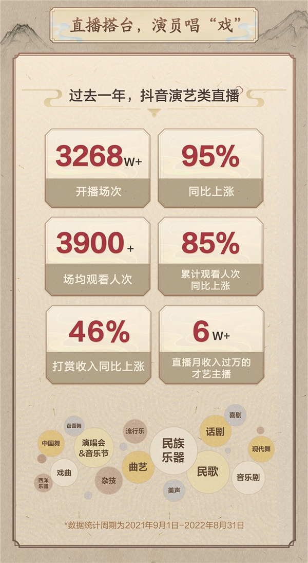 报告还显示,过去一年,包括戏曲、乐器、舞蹈、话剧等艺术门类在内的演艺类直播在抖音开播超过3200万场,场均观众超过3900人次,相当于每天都有近9万场中等观众规模的演出在抖音上演。直播打赏也为演艺经济注入新的生命力。报告披露,2022年抖音演艺类直播打赏收入同比增长46%,超过6万名才艺主播实现月均直播收入过万元。