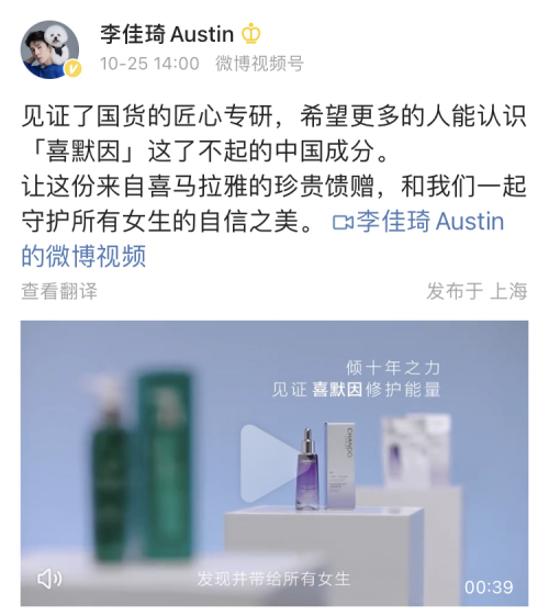 在此次双11预售前夕播出的《所有女生的offer2》第五期中,伽蓝集团自然堂作为国货爆品的首位出场嘉宾,以不输国际大牌的科技含量、超高性价比以及真诚的优惠力度,让对于选品及福利要求都极严的李佳琦觉得诚意满满;紧接着在天猫双11预售开启之后的第二天,也就是10月25日,自然堂又发布了一支与李佳琦合拍的《特别的算法》短片,李佳琦以第一视角,将伽蓝集团通过10年努力,以“天算法则”和“人算法则”相结合获得的创新成分——“喜默因”娓娓道来,告诉消费者成分背后的故事。
