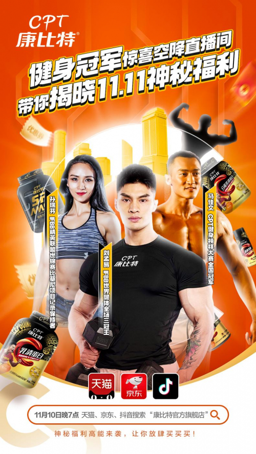 双十一之际,康比特再次邀请IFBB世界健体全场三冠王—刘孟易、CPT健身榜样大赛全国冠军--马佳文、IFBB精英联盟世锦赛比基尼项目记录保持者--孙瑞芬空降天猫、京东、抖音三大平台“康比特官方旗舰店“直播间现场,健身大佬现场教学,教你如何进行科学营养补充,一起塑造完美好身材,更有双十一神秘福利等你解锁。
