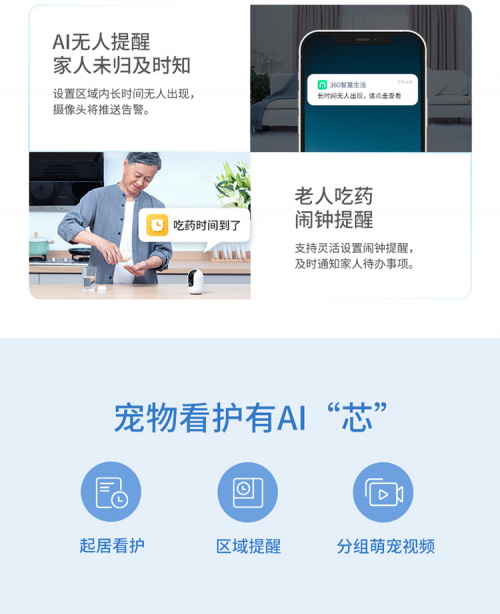 在外工作难免担心孩子是否按时回家、老人是否忘了服药等琐事,360云台摄像机8Max支持本地和云端双重AI人物识别,孩子放学、老人回家及时掌握更安心,如果家人长时间未出现,AI也会及时通知。养宠物的朋友,也可以用AI看护喂食区、玩耍区、危险区等区域,宠物的情况一目了然。8Max支持灵活设置闹钟提醒,可以及时通知家人处理待办事项。