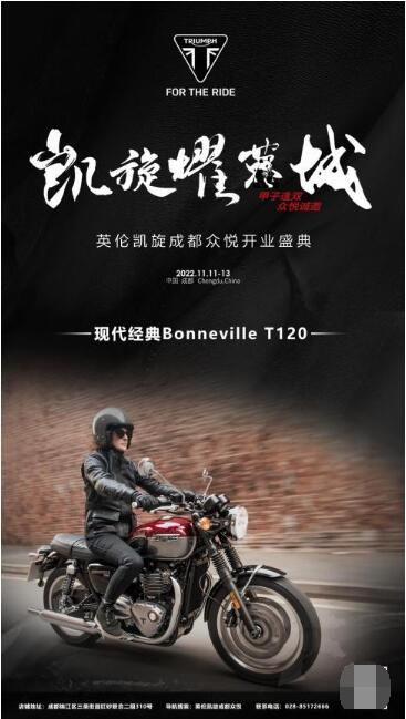 2022年11月,成都——在源远流长的世界摩托车发展史上,英伦凯旋的声誉和地位不仅源于精致的制作工艺和工程设计,还来自品牌从1902年创立以来的优质传承。无可比拟的纯正基因和傲人的历史成就成为凯旋至高品质的象征。它走过历史,跨越百年,独特性不可复制;它承载记忆,历史厚重,兼容气魄而享誉内外。在品牌诞生120周年之际,英伦凯旋闪耀蓉城。11月11日Triumph英伦凯旋成都众悦与您携手扬帆起航。