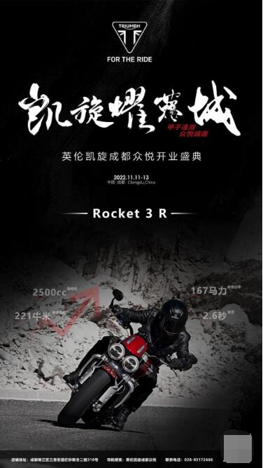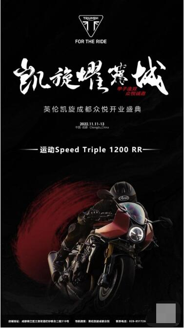 在暖冬的11月,Triumph英伦凯旋 成都众悦正式揭开了以“凯旋耀蓉城”为主题的狂欢序幕,在嘉年华活动期间,周边骑行、场地试驾、Triumph生活体验、主题派对等一系列体验将接踵而至,全力呈现多维合一的趣味互动和精彩现场。除了摩托车本身,Triumph英伦凯旋 成都众悦还致力于打造一种品味、艺术、健康有趣的生活方式,让复古与时尚,激情与动感,热情与狂欢在Triumph英伦凯旋 成都众悦开业盛典中发酵,唤醒每一个热爱凯旋品牌,热爱骑行生活的人内心深处的感动,共赴荣耀时刻。