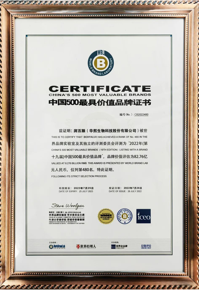 华熙生物旗下核心战略品牌“润百颜”登录“中国500最具价值品牌”榜单品牌价值进一步显现
