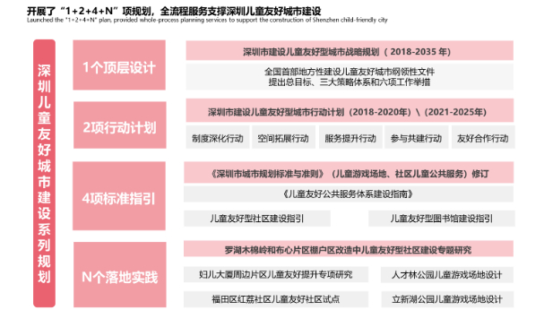 《深圳市建设儿童友好城市系列规划》结合中国国情与深圳儿童成长面临问题,开创探索了本土化、系统性的儿童友好型城市建设路径,推动了联合国儿基会“儿童友好型城市”相关项目在中国的落地,并为国内儿童友好城市政策的制定和实践提供了可借鉴的深圳样板。