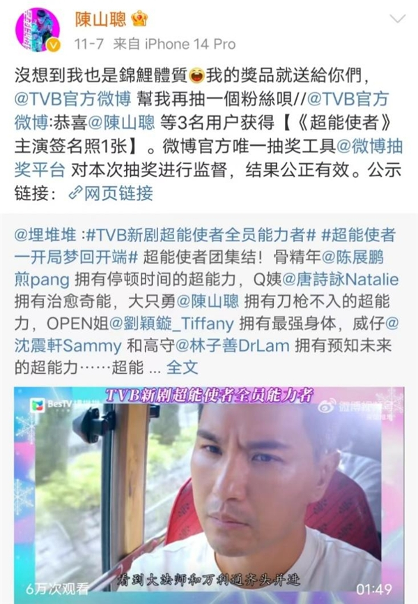 TVB官方微博就此趁热打铁,举办微博抽奖活动与粉丝互动。有意思的是,《超能使者》主演之一的陈山聪参与转发还中奖了!他笑言自己是锦鲤体质,博得一众粉丝欢笑不已。