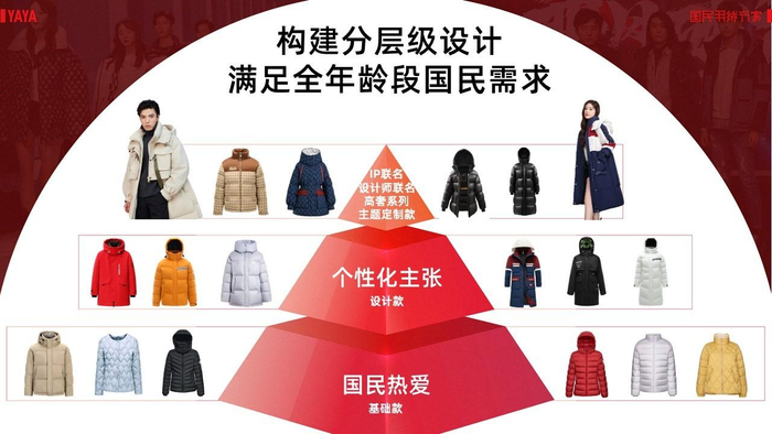 以产品为例,YAYA鸭鸭聚焦羽绒服极致单品类,大力推进产学研合作,联合武汉纺织大学研究院、中国纺织科学研究院共青分院,进一步加大产品研发和科技创新力度。并通过产品差异化分级,满足不同人群的需求。向上打造高端系列产品,与国际知名设计师、IP进行合作,拓宽中高端消费群体。向下推出平价基础产品,打造高品质的性价比款式,满足消费者的日常穿搭需求 。