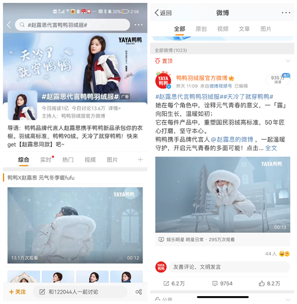 官宣当天不到5小时, #赵露思代言鸭鸭羽绒服#的话题阅读量破亿,官博微博阅读量近1000万。双方在立冬后第一天的强强联合,为寒冷的冬天带来了暖意。