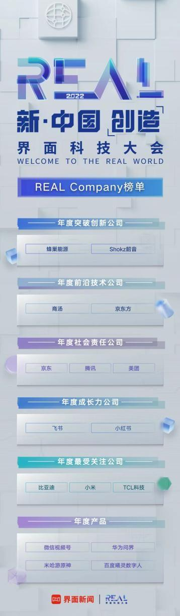 本次大会公布了万众瞩目的2022“REAL Company”榜单,专业运动耳机品牌Shokz韶音斩获“年度突破创新公司”大奖。除能代表中国互联网和新产业的京东、腾讯、比亚迪、华为、美团之外,Shokz韶音在大会中获得极大关注的品牌,成为全场黑马之一。