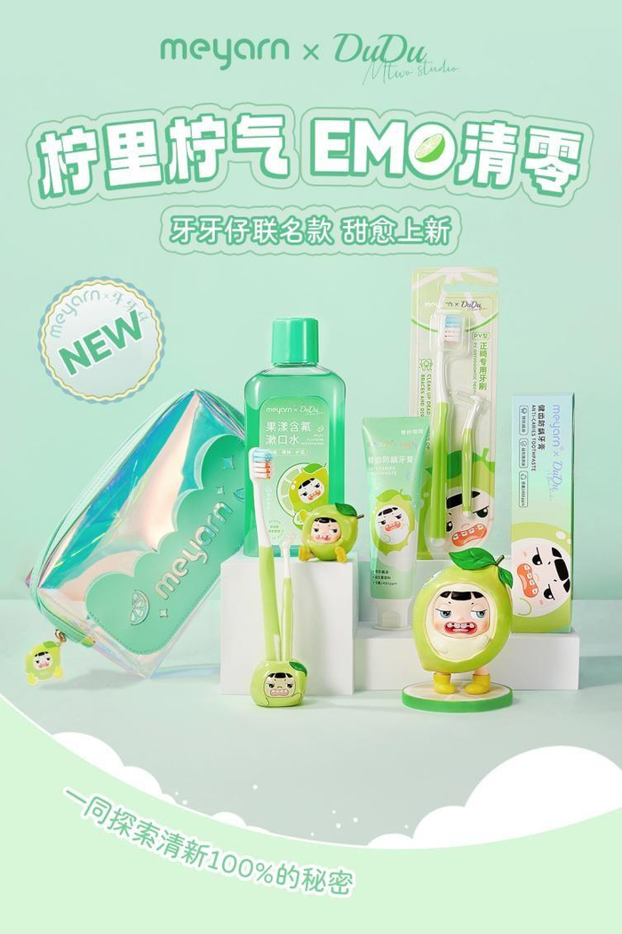 此次联名包含了meyarn米妍口碑能打的PV型牙刷、防龋牙膏和含氟漱口水3款产品,无论从创意内核还是产品设计研发上都花费了不少心思。青柠牙牙仔的IP形象,是DuDu牙牙仔基于meyarn米妍产品“青柠口味”的特征原创设计的。它造型可爱,就像是一颗饱满多汁的水果,青绿的颜色与品牌视觉相呼应,戴着小钢牙的微笑给与用户萌愈正向的鼓励。配合“柠里柠气,EMO清零”的联名主题,在融合潮玩元素的同时,精准种草核心用户,使产品更易传播,在正畸用户心中留下记忆点。
