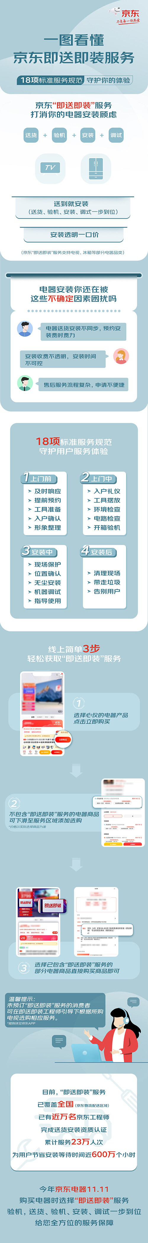 截至目前,京东电器“即送即装”服务已覆盖全国京东物流配送区域,有近万名京东小哥取得送货安装的资质认证,为消费者节省安装时间近600万个小时。京东电器“即送即装”服务实现了时效和服务的双重整合,增加了家电安装服务过程中的确定性,在电器销售集中爆发的11.11期间,为消费者提供送货、验机、安装、调试四步一体化服务,进一步优化了消费者在购买电器时的全流程服务体验。
