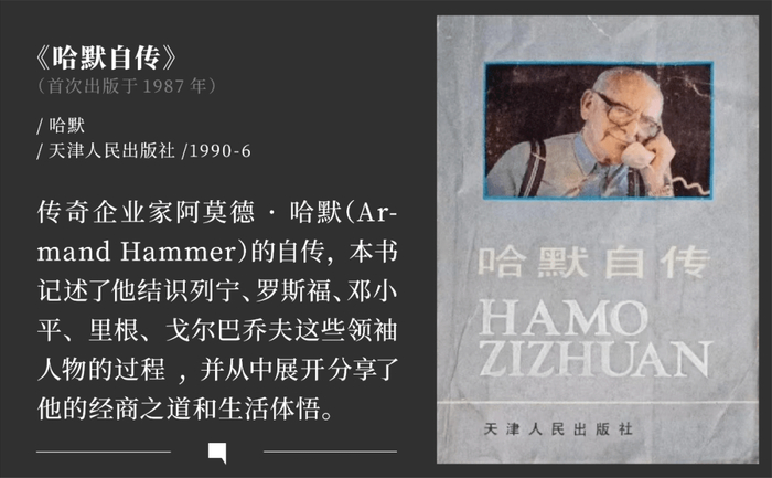 许知远 :对,《哈默自传》,看得我惊心动魄,原来中国是这样开始改革开放的。我们这两代人的成长过程中,视觉上的冲击是很少的,书给了我们最丰富的可能性。薄薄的一本就是一个崭新的世界。