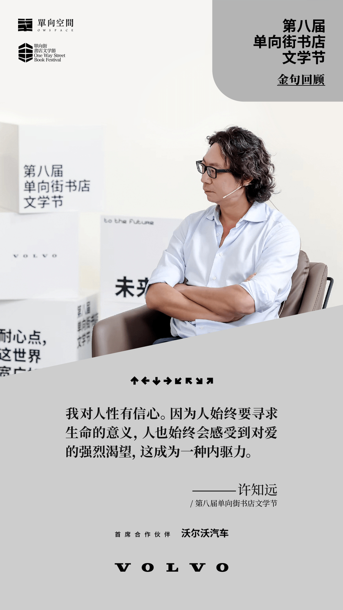 特别感谢帮助今年文学节实现的 首席合作伙伴,沃尔沃汽车 。从许知远老师《十三邀》到今年的文学节,沃尔沃汽车一直把汽车工业和人文关怀连接在一起,尤其会给到类似单向街书店的文化机构非常坚实的支持,在不确定的年代里找到属于这个行业的安全感,感谢沃尔沃汽车对文学节的支持!