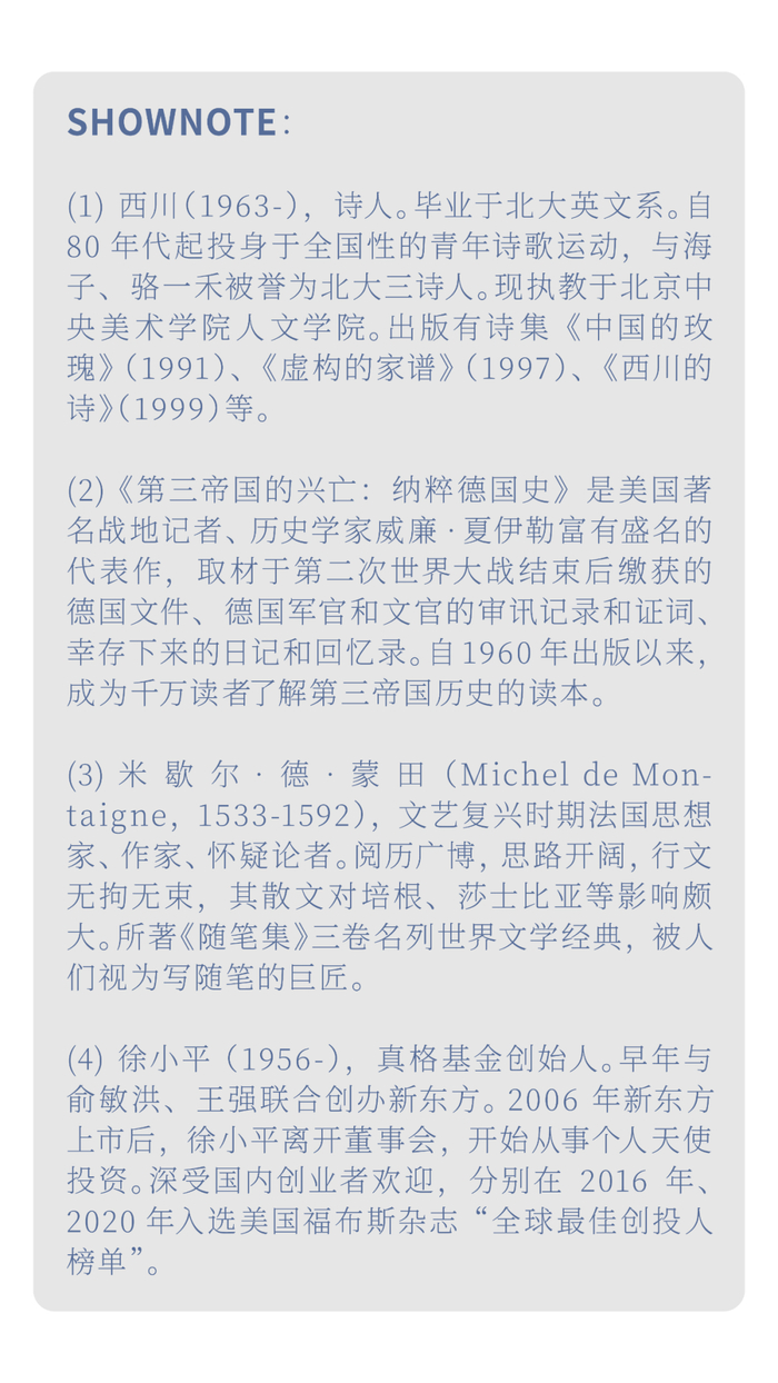 我本身就是学文科的,上来就学西方文学史,老师讲课提到的书就变成我们的日常必须要读的书,再加上周边同学的熏陶,当时北大读书氛围非常浓。我进北大第一天,把行李放在床上回头一看,隔壁一个同学躺在床上读书,很厚一本,叫《第三帝国的兴亡》(2)。我那时候还觉得自己到北大去不就是为了学英语,怎么读这么厚的书,同学白了我一眼,根本没理我。这个同学真写了一本书,之前还找我给他写了序。
