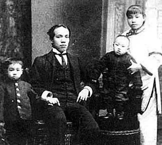 1905年,梁启超与长女思顺,长子思成,次子思永于日本东京合影。