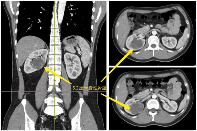 患者张博士目前在国内顶尖学府从事科学研究工作,经体检发现双肾多发性囊肿。其中较大的一个囊肿位于右肾,直径达5.2厘米,内部有多发分隔,囊性肾病Bosniak分级为IV级,提示为囊性肾细胞癌。