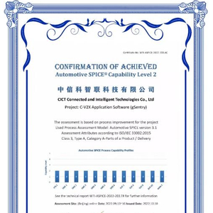 近日,中信科智联科技有限公司(原大唐高鸿智联)自主研发的C-V2X应用(C-V2X Application Software (gSentry) )成功通过 ASPICE Level 2认证。标志着中信科智联在面向汽车领域的C-V2X应用软件开发过程及质量管理能力已达国际领先水平,满足全球主流汽车厂商严格的质量要求!