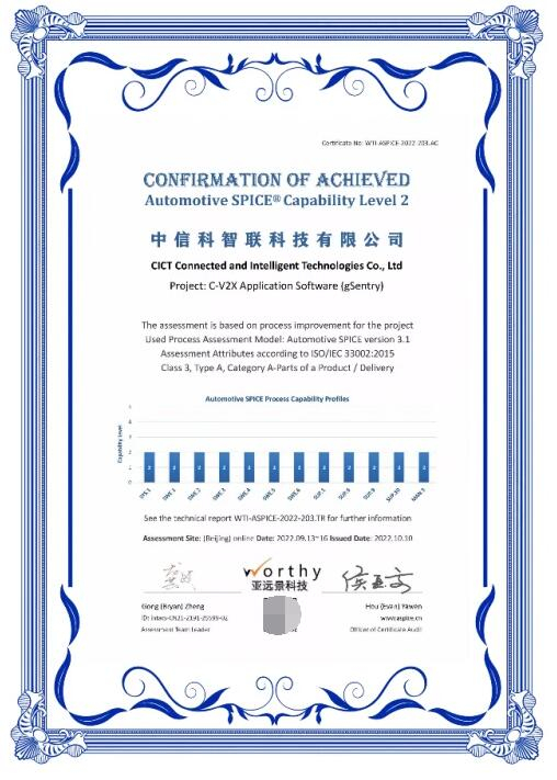 中信科智联自主研发的C-V2X应用软件成功通过ASPICE Level 2认证,核心竞争力再升级!