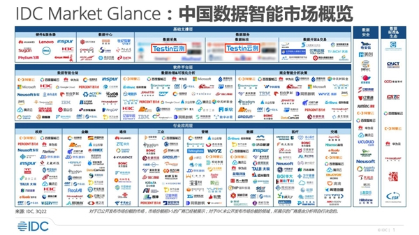 随着数字经济、企业数字化转型、新基建多概念交织叠加,以数据为核心的业务分析决策市场需求不断攀升,产业发展迎来新的机遇。国际权威市场研究机构IDC近日发布了《Market Glance:中国数据智能市场概览,2022》报告,展示了中国数据智能市场的构成和格局,并梳理出不同细分市场领域的主要技术服务供应商,并绘制出了市场地图。