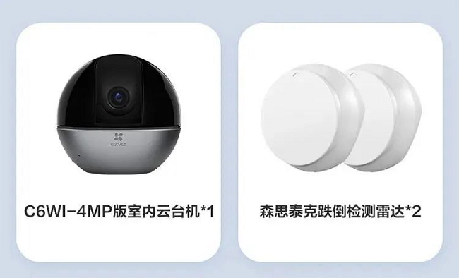 跌倒检测套装内搭配有1台萤石云台摄像机C6Wi-4MP和2台跌倒检测雷达,可以进行联合检测跌倒,提高识别的精准度。只要将两个设备对准统一检测区域,看护服务即可采集视频画面以及跌倒雷达的反射数据,从多维度的姿态数据信息识别老人的状态,精准检测老人跌倒,无需佩戴相关设备即可完成远程无感跌倒检测。