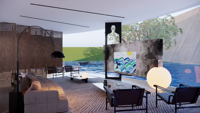 勒内·玛格丽特是比利时著名超现实主义画家,他的画风带有明显的符号语言,创造出了众多具有神秘语意的迷人画作。设计师创造出的画家玛格丽特之家则引用眼睛轮廓抽象化打造出心中勒内大师的超现实居所。而三星The Frame画壁电视则和谐融入了抽象化的家居氛围,紧密契合同类型风格的入户玄关和客厅电视背景墙。其极窄边框则完美营造出艺术画作既视感,为用户打造高度沉浸的艺术体验。