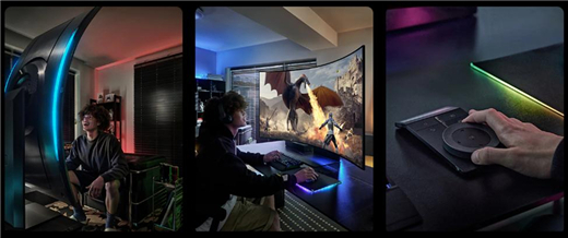 此外,三星OLED电竞显示器采用一体化机身设计,摒弃了传统显示器的臃肿背板,最薄处仅有3.9mm,简约时尚,超薄底座也不占用桌面空间。其背部配备涡轮灯环,有多种灯光循环模式,若您开启光环同步,氛围灯颜色将与画面风格同步变化,让各位玩家全方位沉浸在游戏世界中。