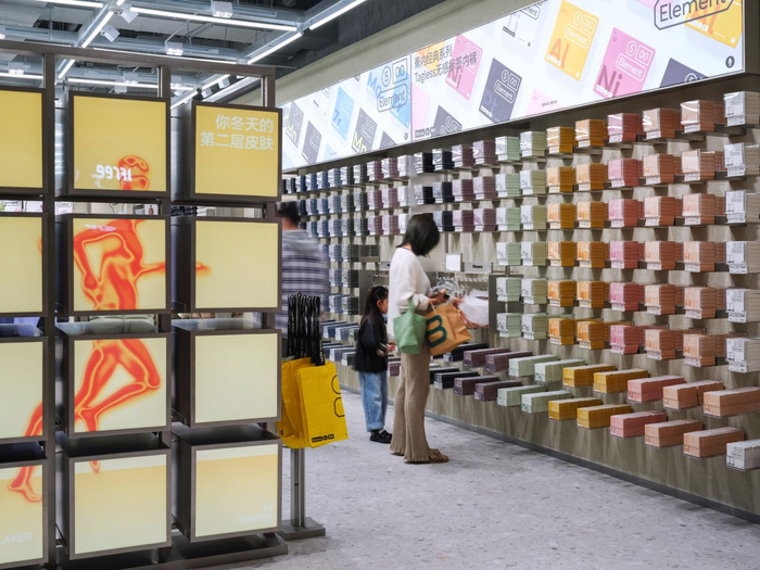 蕉内线下门店的每次「着陆」都能成为新晋的网红打卡地。 不同于之前门店金属感的风格,这家杭州新店空间设计「归于基本」,选用木纹石材和肌理漆,道具和空间的线条感相呼应。摒弃传统的陈列方式,让产品成为主角,形成蕉内特有的「秩序感」。以体感科学为基石的蕉内,其线下门店也承载着消费者对产品和品牌的感知和体验,让消费者能在特有的舒适环境中感受背后的产品力。