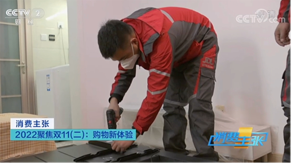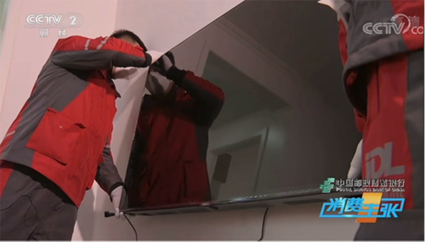 在央视《消费主张》栏目的采访过程中,王某现场体验了一把京东电器“即送即装”服务,当天上午,两位京东物流小哥携带王某购买的电视,准时出现在了他家门口,物流小哥主动出示证件、穿戴鞋套、布置地垫等流程一气呵成,在得到王某允许后,两位京东小哥进入家中,在得知电视挂装点位后,其中一位工作人员拿出仪器对墙壁管线进行检查,另外一个小哥麻利的进行电视支架安装工作,在墙壁打孔前,还特意用垃圾袋粘在墙壁上,以免墙屑污染室内环境。随着电视顺利挂墙后,京东小哥还耐心给王某讲解起电视使用方法,安装全程透着干练专业。面对央视的镜头,王某表示,有了京东电器“即送即装”服务,让家电安装更省心了。