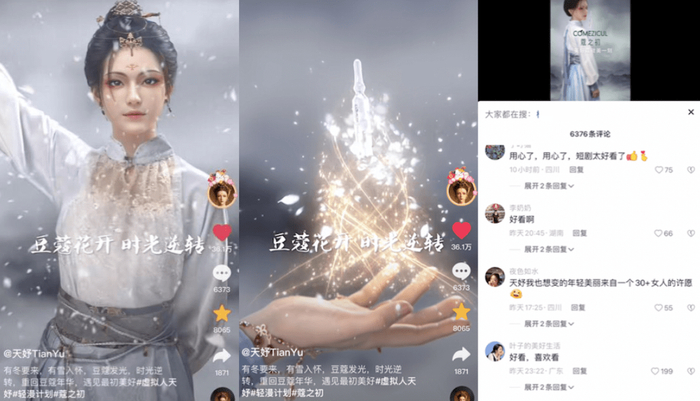 第二种形式:虚拟美妆达人联动直播间。当其他美妆品牌还在拼直播、拼价格,蔻之初把直播间半边席位让给了虚拟人。不仅有虚拟美妆达人本善做客直播间,还有第一文化出海国风虚拟人天妤出演联名短片。短片仅上线一天,点赞量就达到了36万。作为今年双十一备受关注的新现象,当大多数品牌还没明白虚拟人是什么,流量密码已经被蔻之初玩明白了。