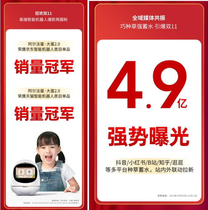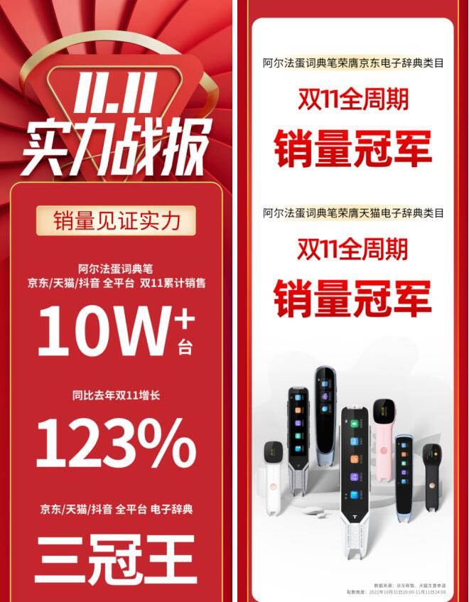 数据显示,阿尔法蛋词典笔京东、天猫、抖音全平台双11累计销售10W+台,同比去年双11增长123%,荣膺三平台电子辞典三冠王。阿尔法蛋词典笔荣膺京东和天猫电子辞典类目双11全周期销量冠军。同时,阿尔法蛋AI词典笔T10荣膺抖音电子教育类目双11全周期销额冠军,阿尔法蛋AI练字笔荣膺京东和天猫智能练字笔双11全周期单品销量和销额双冠王,阿尔法蛋·大蛋2.0荣膺京东和天猫智能机器人类目单品销量冠军。此外,抖音、小红书、B站、知乎、逛逛等多平台种草蓄水,站内外联动拉新,强势曝光4.9亿。这也再次用实力证明阿尔法蛋在消费者心中的影响力和认可度。