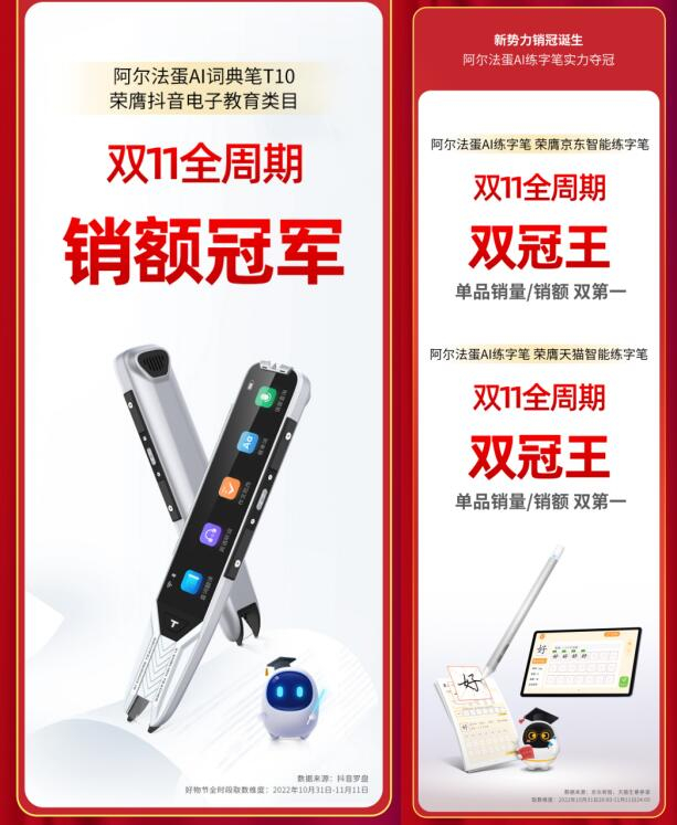 此次在双11榜单中揽获冠军的阿尔法蛋AI词典笔T10、阿尔法蛋AI练字笔和阿尔法蛋·大蛋2.0,不仅再次体现了阿尔法蛋产品的超硬核产品力,也再次证明了高品质才是热销根本。