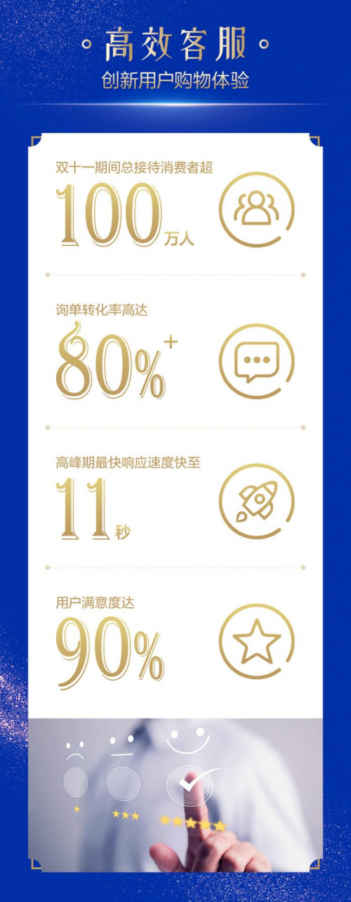 客服方面,双十一大促期间顾客咨询量暴增,若羽臣客服团队双十一期间总接待消费者超100万人次,询单转化率高达80%,高峰期售后服务响应时效最快达11秒,用户满意度达90%,远超行业平均水平。