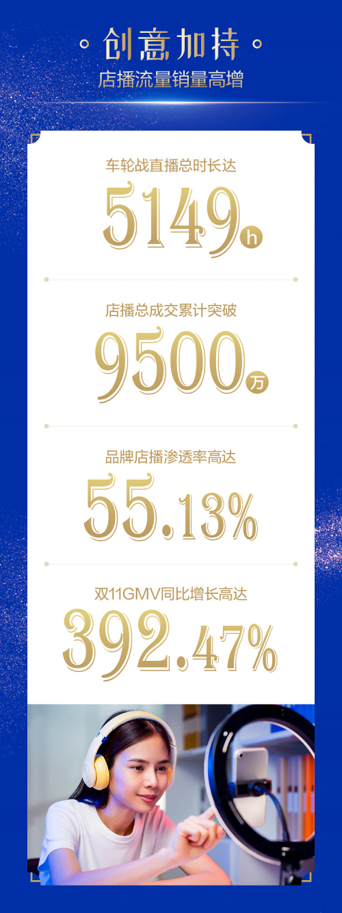 内容营销方面,凭借沟通场景的精准打造、创意内容的贴切匹配,以及平台资源的高效沟通,若羽臣所服务的品牌直播间在双十一期间,实现车轮战直播总时长5149小时,店播渗透率高达55.13%,店播总成交累计突破9500万,双十一GMV同比增长高达392.47%。