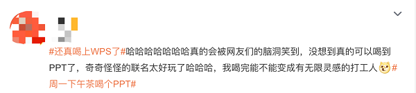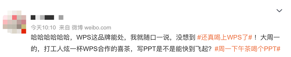 此次办公软件和茶饮品牌的梦幻联动,引发众多年轻网友热议。网友纷纷表示,“WPS都能喝了!”、“还真喝上WPS了”、“WPS和喜茶联名了?这是打工人的双厨狂喜吗?”。