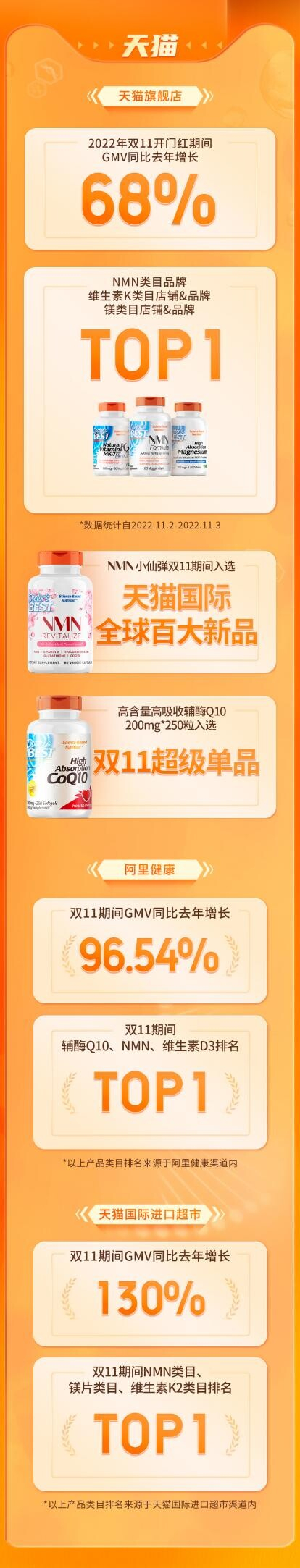 根据Doctor's Best多特倍斯官方数据显示,天猫旗舰店2022年双11开门红GMV同比增长68%,阿里健康大药房海外店增长96.54%,天猫国际进口超市同比增长130%。Doctor's Best多特倍斯登顶NMN类目品牌TOP1、维生素K类目店铺&品牌TOP1、镁类目店铺&品牌TOP1。