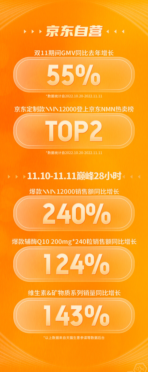 Doctor's Best多特倍斯京东平台GMV增长55%,爆款产品nmn12000销售额同比增长240%,辅酶Q10销售额同比增长124%,维生素&矿物质系列销量同比增长143%。值得一提的是,Doctor's Best多特倍斯双11期间还荣获了京东健康颁发的2022年度潜力品牌奖。
