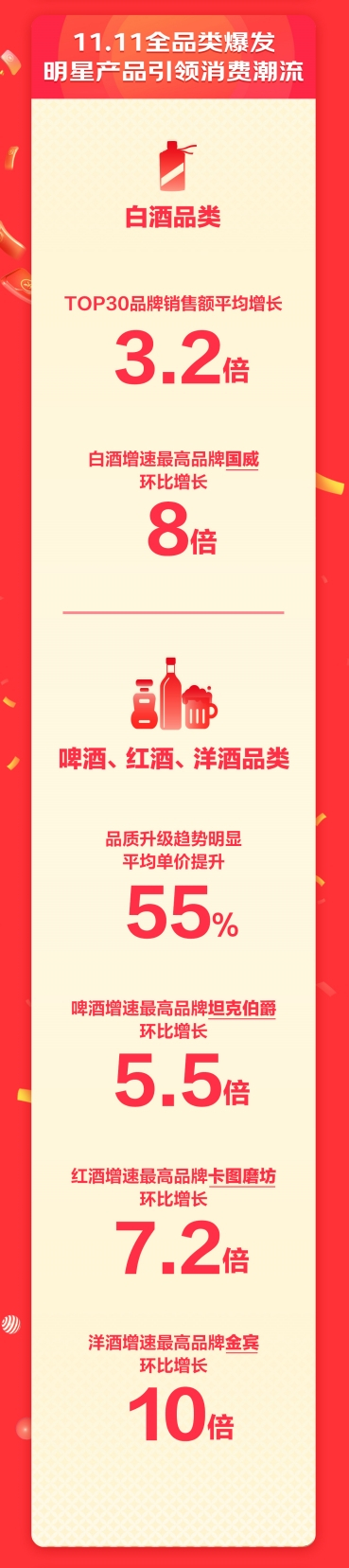 以往的双十一,酒类零售市场热度平平,线下门店更是无人问津,但今年各大酒水品牌在京东酒世界线上线下深度融合的模式下,表现出亮眼成绩。作为活动主推品类的白酒商品呈现热销趋势,其中白酒TOP30品牌销售平均增长为3.2倍。作为京东酒世界首款严选定制单品——国威G9 53度酱香型白酒凭借其正脉茅香风味和超高性价比,成为京东酒世界11.11白酒增速最高品牌,销售环比增长达8倍。同时,啤酒、洋酒、红酒也呈现品质化趋势,平均单价提升55%,坦克伯爵、卡图磨坊、金宾等品牌倍受年轻用户青睐。