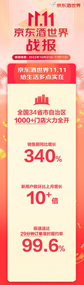 “销售额同比增长340%;新用户增长超10倍;TOP30白酒品牌销售额平均增长3.2倍;啤酒、红酒、洋酒平均单价增长5成以上……”这就是京东酒世界携百城千店交出的11.11成绩单,也是京东酒世界线上线下融合新模式在全国落地后的一次“大考”成绩单。