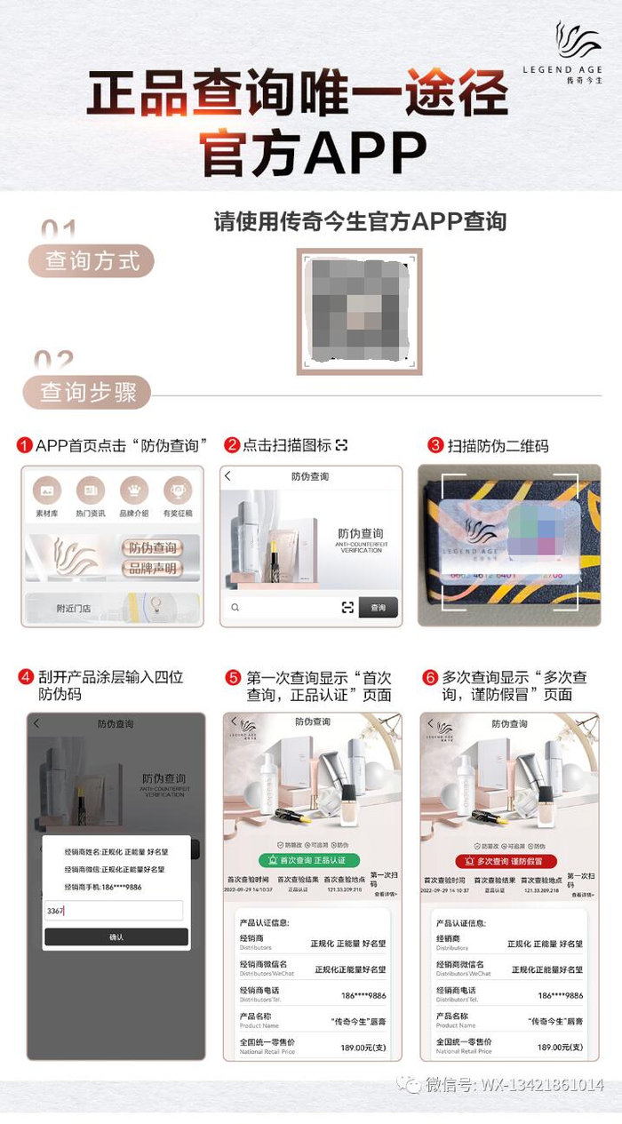 此外,在检验产品正品时,可使用传奇今生官方APP查询,在手机应用商店下载安装传奇今生官方APP后,打开APP,然后在APP首页点击“防伪查询”,扫描外包装上的防伪二维码,接着刮开产品涂层输入四位防伪码,第一次查询显示“首次查询,正品认证”页面,多次查询后显示“多次查询,谨防假冒”页面,即为正品。
