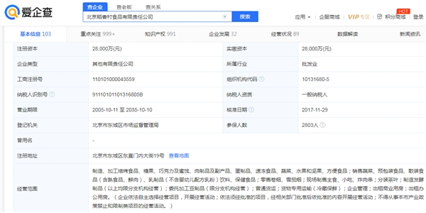 爱企查信息显示,北京稻香村食品有限责任公司的经营范围包括制造、加工焙烤食品、糖果、巧克力及蜜饯、肉制品及副产品、蛋制品、速冻食品、蔬菜、水果和坚果、方便食品;销售蔬菜、预包装食品、散装食品(含熟食品、鲜肉)、乳制品(不含婴幼儿配方乳粉)饮料、保健食品;零售卷烟、雪茄烟;现场制售主食、小吃、炸肉串;分装茶叶……涉足领域众多,更加直观地展示了北京稻香村经营内容的“杂”。