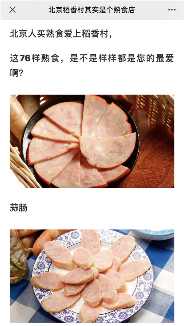 不仅近期的《北京稻香村其实是个熟食店》等文章,此前就曾有网友整理出北京稻香村熟食集合在网络上分享。松仁小肚、蒜肠、茶肠等肉制品,炸小黄鱼、炸藕盒等炸物,腐竹丝、素牛肉等豆制品,肉末炒豇豆、宫廷四宝等小菜,近百种的熟食让北京稻香村更像一家“杂食店”。