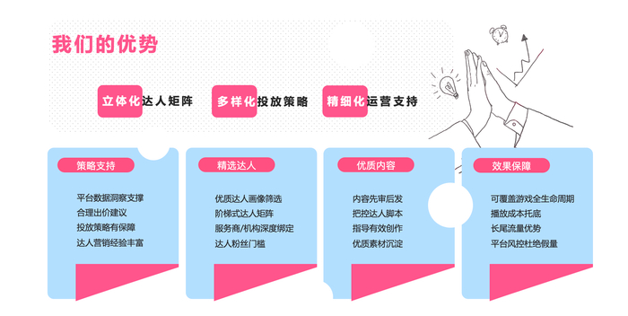 对于厂商而言,不论预算是否充足,营销托管服务都会为客户制定相应的玩法策略,甚至全案营销策划,免费帮助游戏厂商找到最合适的达人营销获量手段,包括不限于效果类任务、一口价、全家桶综合玩法等多样化、个性化的玩法。