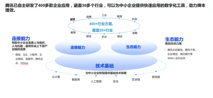 腾讯公司高级执行副总裁、云与智慧产业事业群CEO汤道生远程致辞时表示,数字化可以帮助中小企业快速连接市场、挖掘潜在需求,也可以优化产销流程,提升经营效率。目前,腾讯与合作伙伴在云上提供了400多款企业应用,涵盖30多个行业,其中大部分可以为中小企业快速应用,助力降本增效。腾讯公司副总裁马斌提出,中小企业数字化转型不易,腾讯始终致力于发挥自身技术、连接、生态等优势,以小精快准的方式来解决中小企业数字化转型中的问题,帮助中小企业“降本增效提质”。