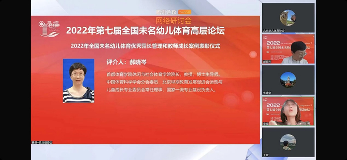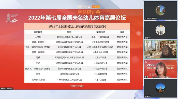论坛还举行了此外,为表彰全国幼儿体育领域的创新实践,在本届论坛筹备之际,还同步进行了2022年全国未名幼儿体育优秀案例的表彰仪式和专题报告征集活动。本次案例征集活动论坛设立了全国未名幼儿体育优秀研究成果、优秀园长管理案例、优秀教师成长案例、优秀实践案例,以及优秀企业管理和创新项目案例等多个优秀案例奖项,共征集到来自全国各地各类优秀案例400余例,通过全国高级别专家组的交叉匿名评审,最终评选出各类优秀案例“特别优秀奖”共27个名。上午的表彰仪式由国家体育总局体育科研所研究员王欢教授、首都体育学院休闲体育学院院长郝晓岑教授、北京市特级教师范惠静老师、以及北京幼儿体育协会副会长张路平对各类获奖案例进行了评介。下午的四场专题报告,由所有特别优秀奖的获奖案例作者对案例进行了展示。首都师范大学学前教育学院张首文副教授、国家体育总局体育科研所研究员王欢教授、北京幼儿体育协会培训部主任门晓坤、北京早期教育协会儿童与运动成长专委会秘书长吴希林副教授分别对各类专题报告进行了主持和点评。所有获奖的优秀案例都于12日上午进行了线上表彰,并于当日下午进行了专题报告。