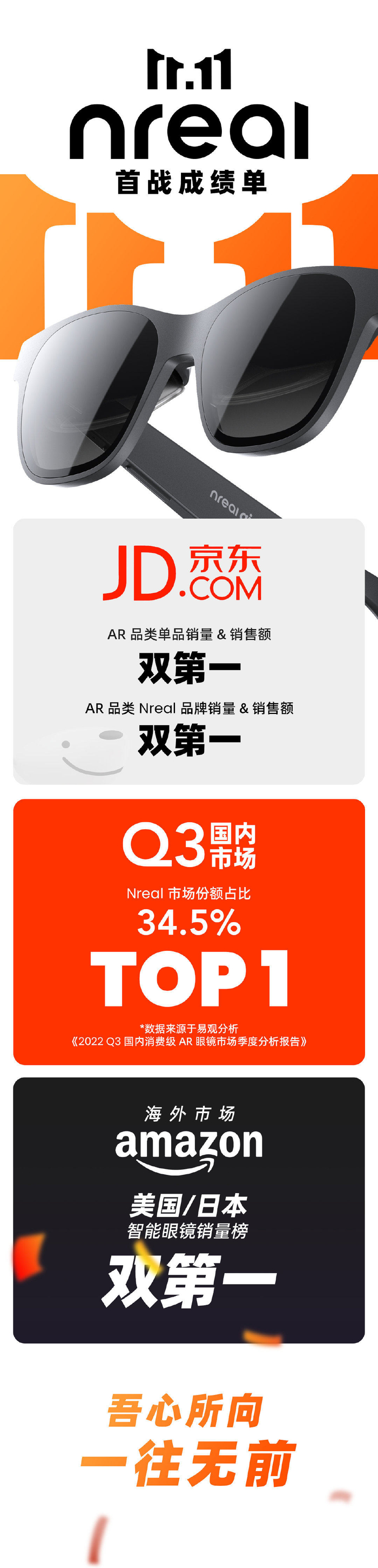 2022双11正式落下帷幕,相关品牌战绩陆续出炉。新兴消费电子品类AR眼镜品牌中,Nreal斩获京东平台AR品类总销量及总销售额双第一,取得了Nreal回归中国市场后参与的首个电商促销活动开门红。除中国市场取得亮眼成绩外,Nreal在海外市场也发展得粲然可观,尤其在美国和日本,亚马逊平台持续占据智能眼镜品类销量榜第一。此前易观分析发布的调查报告显示,Nreal在2022 年第三季度国内消费级 AR 眼镜市场中,以34.5%的市场份额位列第一。显然,Nreal能在此次双11中取得排名第一的位置,符合市场预期,是惯性增长的延续。