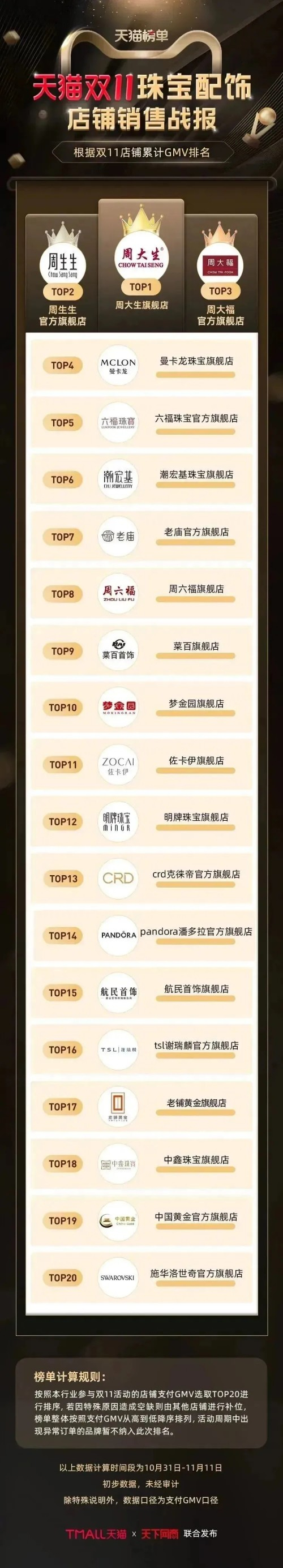 值得关注的是,今年双11期间,周大生线上全渠道GMV超过周生生、周大福,实现了由行业第三跃升至行业第一的高速增长,成为2022双11珠宝配饰市场的一抹亮色。