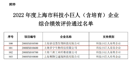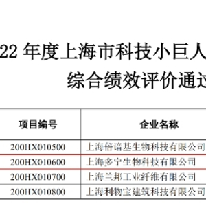 近日,《2022年度上海市科技小巨人(含培育)企业综合绩效评价结果的通知》公布,上海多宁生物科技股份有限公司(简称“多宁生物”)顺利通过综合绩效评价,入选“科技小巨人培育企业”。