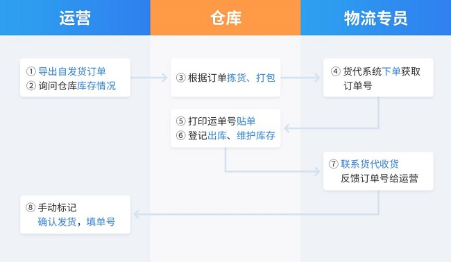 仓库人员配置较少的卖家: 选择待处理的销售出库单→打印面单→线下拣货打包→确认出库
