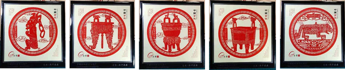 青铜国宝系列剪纸来自号称江南青铜王国的吉安市新干县,该系列剪纸融合青铜国宝系列,包括四足铜甗、乳丁纹虎耳方鼎、伏鸟双尾铜虎、虎耳夔形扁足圆鼎及侧身羽人玉佩饰,造型奇特,纹饰精美,极具新干特色,形成了一道非遗传承的亮丽风景线。