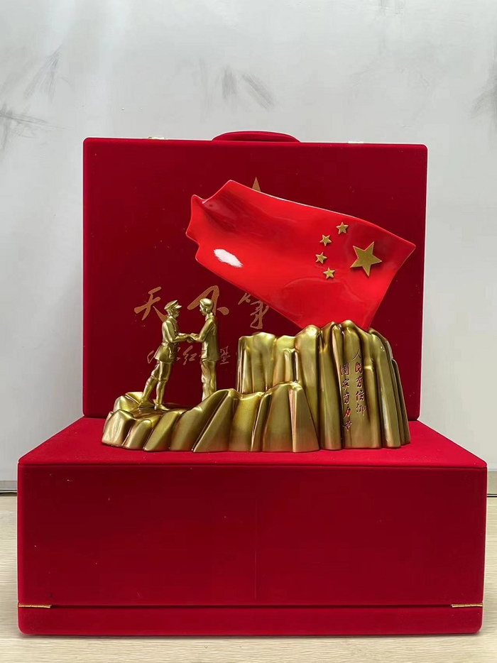 天下第一旗来自吉安井冈山市,以红色主题故事为背景,用全铜浮雕鎏金传统工艺铸造而成,寓意天时、地利、人和,呈现了1928年井冈山胜利会师至1949年新中国诞生的伟大事迹。