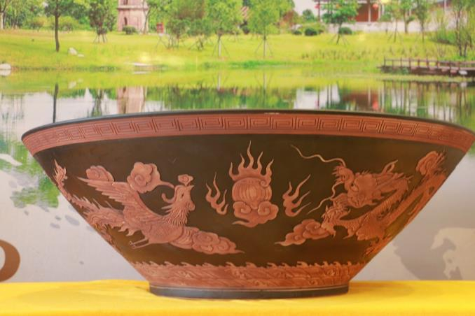 《龙凤呈祥》木叶大盏来自吉安市吉安县,集吉州窑工艺之大成,从设计试烧到成功烧制,历时两年有余,大盏通高45厘米,盏口直径102厘米,是吉州窑瓷器中的罕见大器,为陈设用瓷。